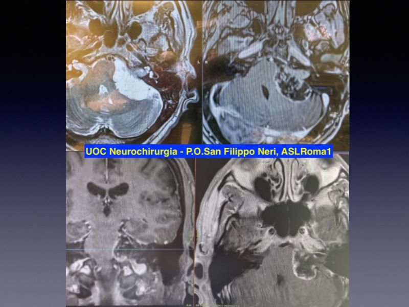 Microneurosurgical nearly total resection by retrosigmoid approach: a thin layer of the capsule of the cyst, very adherent to the brainstem, was left. It will be followed by serial MRI.