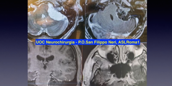 Microneurosurgical nearly total resection by retrosigmoid approach: a thin layer of the capsule of the cyst, very adherent to the brainstem, was left. It will be followed by serial MRI.